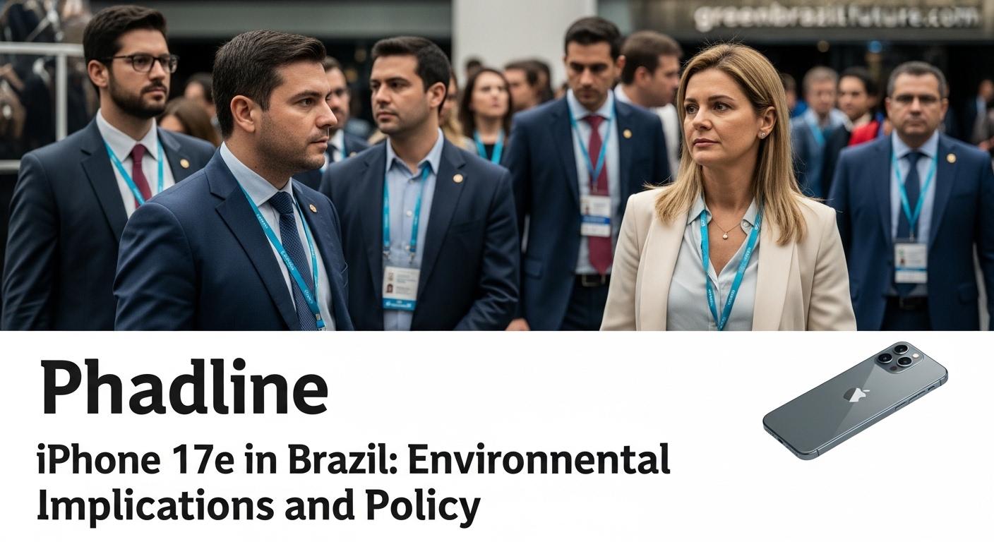 Editorial illustration of iPhone 17e with a Brazilian green-tech theme.